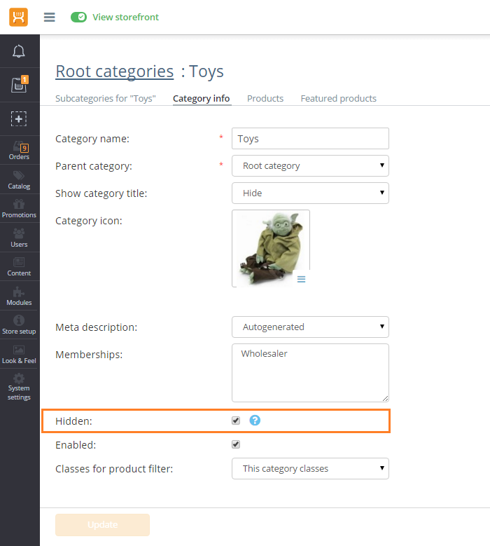 - Hidden categories are not visible on store front unless accessed directly via their url.